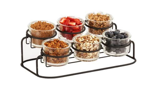 This sleek wire jar holder displays the 16 ounce round glass jars in an elevated, modern design taking up less counter space!