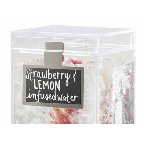 Beverages can be mistaken in beverage dispensers. The Stainless Steel Write-On Beverage Sign allows customers to clearly see what beverages are in the dispensers. Simply lift the lid, place the sign, and the lid secures the sign when placed back on.
