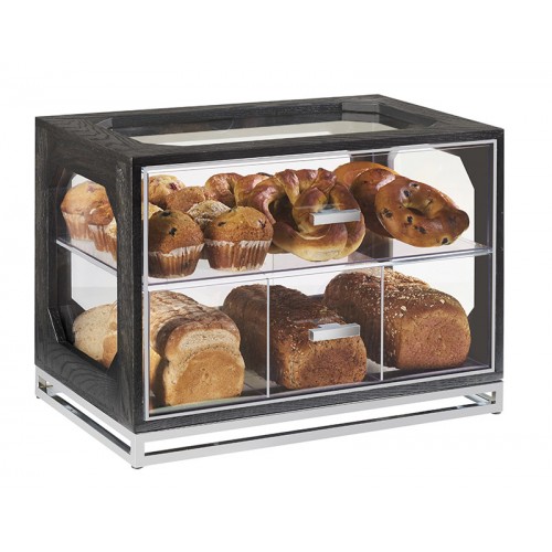 This bread display makes for an elegant presentation to show up your most popular bagels and pastries! Neatly organize what your shop has to offer using the 4 different compartments provided in this merchandiser. From cafes, to catering, guests can appreciate the accessibilty of this self service case.