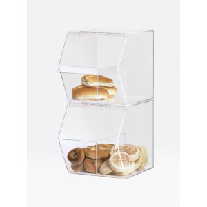 ith these classic stackable food bins! They feature a beautiful, crystal clear acrylic display and shape. They offer a stackable feature that helps save space and organize your baked goods and breads for you guests and customers. Item 948 is built with a divider in each bin to help divide and organize all items. With both of these items, you cannot go wrong!