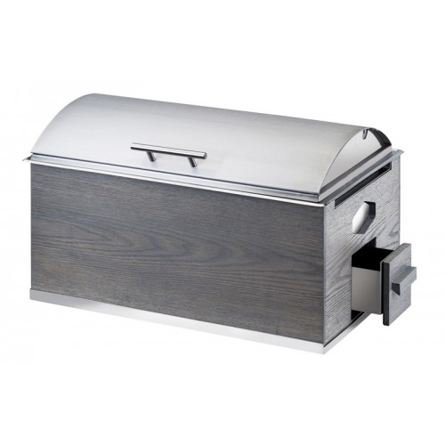Enhance your food presentation at your next event with our full-sized Sierra Chafer! The gray washed oak and polished metal frame will add an elegant touch to any buffet or catering event. The unit includes a stainless steel cover and conveniently has a built in drawer for chafing fuel.