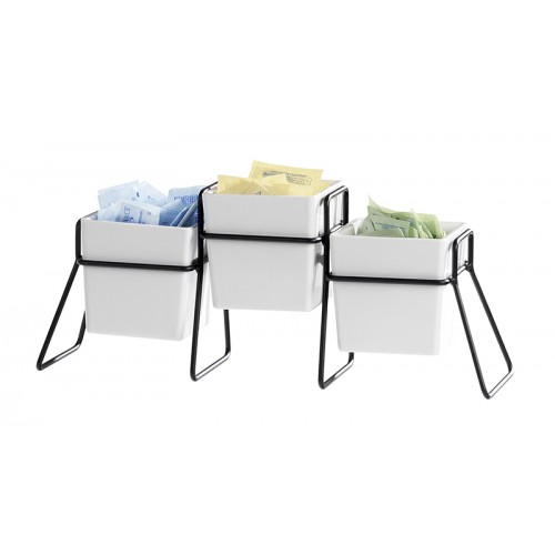 Add a new look to your condiments, with this Black Wire Jar Display! The display includes 3 melamine crocks that can hold packets, condiments, and any other number of items. Use in a foood presentation or as a table center!