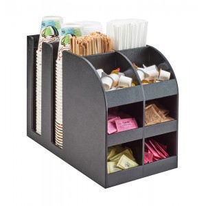 The Bulk Condiment Station is the perfect solution for high traffic areas! With 4 sections for cups and lids, 6 sections for condiments, and 2 more for stirsticks or straws, this sleek organizer is the solution to having to keep restock!