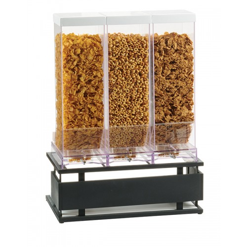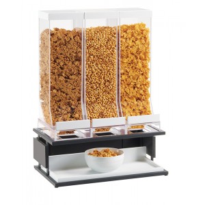 This portion control cereal dispenser features three different bins to fill with multiple cereals of your choice. The same portion is dispensed for every pull to cut down on cereal waste and the metal and wood frame helps provide a dynamic contrast with your cereals.