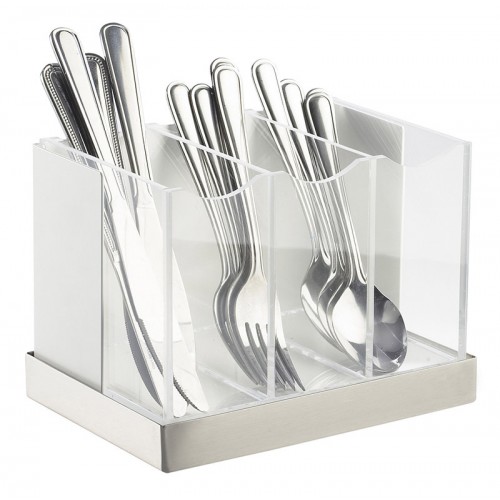 This Luxe flatware organizer is a great addition to your buffet line, cafe, coffee shop, or hotel! With three separate sections designated for forks, spoons, and knives, you can display and organize your utensils in a fashionable, upscale way! Its white metal frame is complemented by a beautiful stainless steel base, while clear acrylic dividers provide complete product visibility, allowing you to showcase your beautiful flatware selection. Guests can easily identify which piece of silverware they're reaching for, making their overall experience more streamlined and enjoyable.