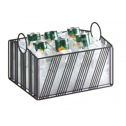 Produce an eye-catching display of bottled beverages, fruits, parfaits and more with the Portland Ice housing. Displayed in an open pan with a black wire frame, the customer will easily view their options at your next buffet, bar or outdoor event.