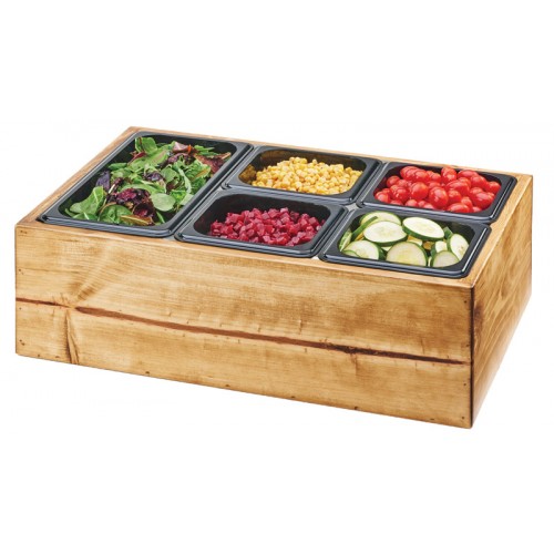 Looking for a warmer way to present chilled salad ingredients? Use the Madera Salad Station! The station has an ice liner, and comes included with 5 pans for your lettuce and condiments. Simply insert the ice and pans, then relax!