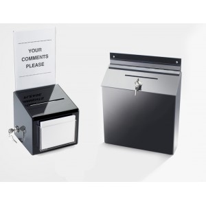 Securely collect your customer comment cards in this suggestion box. The locking suggestion box mounts easily (hardware sold separately) to any wall in your fast food restaurant, diner, buffet, or cafe so you can make improvements to your establishment's services and procedures through valuable customer feedback. This suggestion box's classic, discrete black finish will fit in anywhere without drawing attention from your decor. This unit includes a lock and two keys to ensure that your customers' comments remain private and safe until you're ready to read them.
