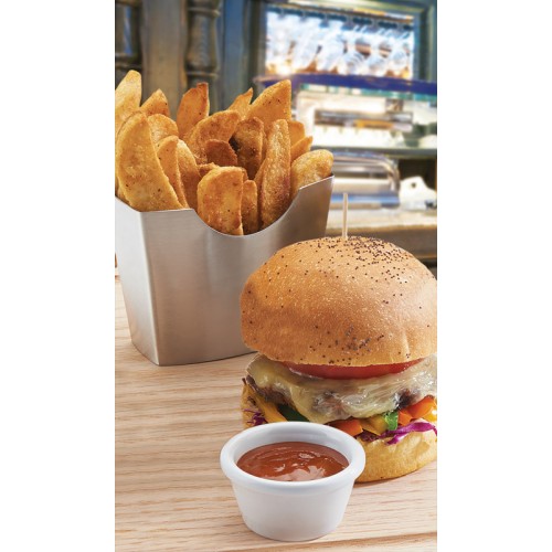 This dazzling French Fry Holder is constructed of brushed, durable stainless steel. Perfect for serving french fries on the side of sandwhiches, burgers, and more!