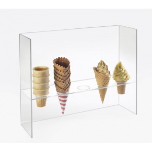 Display unit for holding different flavor & style cones with a built in straight sneezeguard. The Sneezeguard helps protect your cones from airborne contamination. This can be used to just hold cones or to prepare more than one ice cream cone at a time. It has 5 holes measuring 2" diameter each to hold all different types of cones.