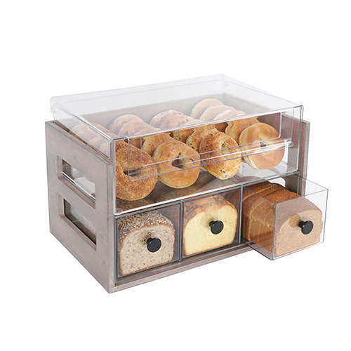 Add a rustic touch to your food presentation with the Aspen Bread Display. It includes 3 drawers for loaves of bread, and a top section for bagels or other pastries. The side cutouts allow light to fill in the case so guests can see in perfectly!