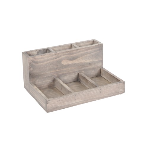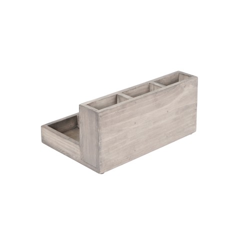 Organize your stir-sticks and packets or teas with this small countertop Aspen organizer. Made up of gray-washed pine, this piece is one-of-a-kind and is sure to keep your tabletops organized and clean!