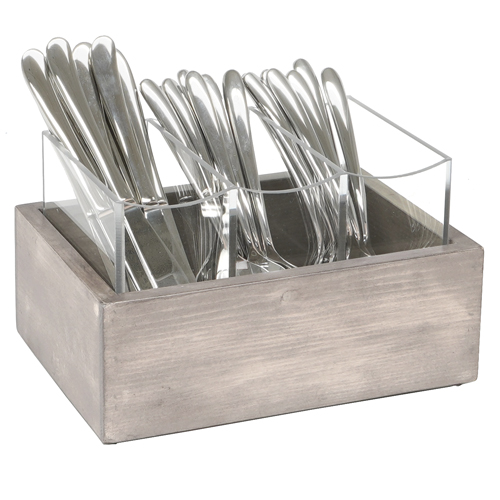 Keep your flatware organized and all in one place with this stunning, one-of-a-kind flatware display. Constructed of gray-washed pine wood and clear acrylic, this organizer keeps your tabletops organized without compromising style.