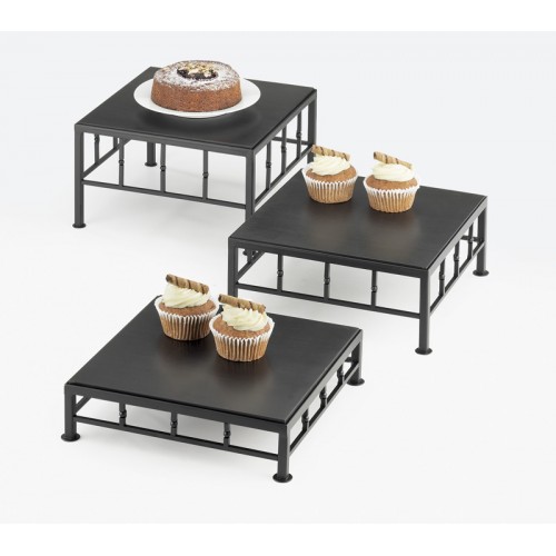 Add dimension and style to your food presentation with these bold iron risers that feature eco friendly bamboo tops. With the bamboo top accented by a black, iron base, this product perfect for displaying delicious appetizers and mouth-watering desserts.