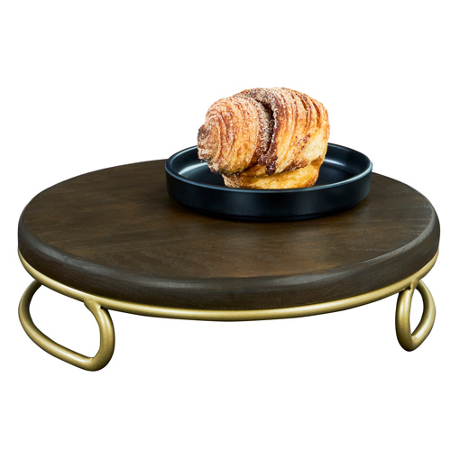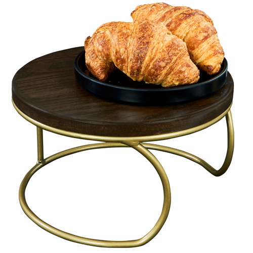 Featuring a matte gold wire base and dark stained oak top, this stunning riser is available in two heights and finshes!