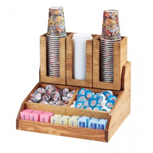 This madera condiment station is the answer you've been looking for. With plenty of room for teas, sugars, or other packets in front as well as two bigger middle sections, this station also has the option to display cups/lids with 3 of the 298-99's!