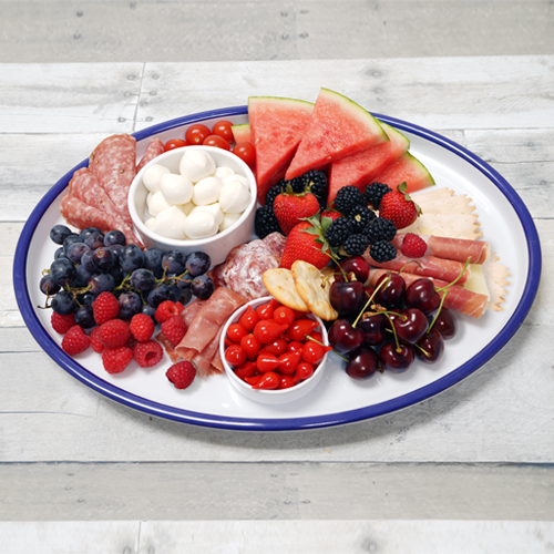 This classic-shaped round platter has new life with the striking blue lip! The 9.5" Diameter gives plenty of room to layer on caprese salads, toothpick appetizers, and countless other options. The raised lip ensures that there is no spilling off the platter when in