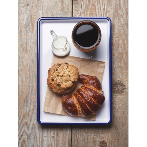 Serve plated foods in style with this trendy Melamine Enamelware Serving Tray! Constucted of durable melamine, this piece is functional and easy to clean! Featuring a bright blue edge on the perimeter of the tray which will complement your food!