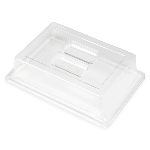 Help protect your culinary creations with the utilization of covers! These crystal clear covers are stackable to allow the customer to have multiple trays at once and feature a notched lid for easy grabbing!