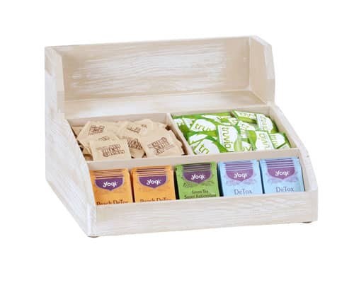 This Newport condiment station is the answer you've been looking for. With plenty of room for teas, sugars, or other packets in front as well as two bigger middle sections, this station also has the option to display cups/lids with 3 of the 298-113's!