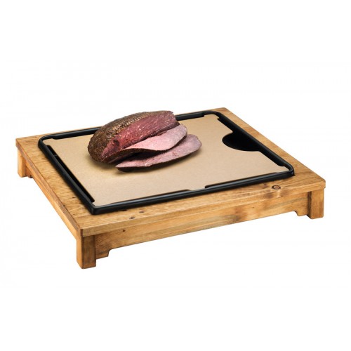 Let the classic look of finished wood invite your buffet guests to sample beef, sliced ham, or savory turkey with this Cut-Mate carving station kit. This carving station kit's attention-grabbing, sturdy wood frame complements any buffet serving area. The carving station kit includes a cutting board, which has a cut out slot to collect scraps, and a place for drippings. The scraps and drippings are kept out of site in the carving station's black plastic drip tray. A clamp is included that can hold most standard heat lamps.
